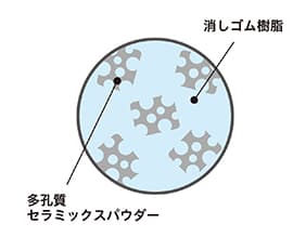 多孔質セラミックスパウダーが無数のカドを生み出し、“いつもカドで消すような軽い消し心地”を実現。消しゴムの粒子が黒鉛粒子を包みこんで、文字をきれいに消します。