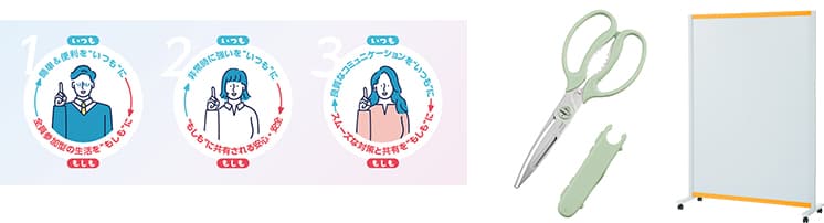 多機能に使える料理はさみや大きく使えるクリップボードなど日常的に使用する道具に便利を追加した製品は、非常時においても簡単で直観的に使えるため、誰もが無理なく参加できる避難生活を実現します。