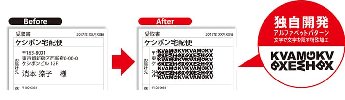 ケシポンシリーズはインクで塗りつぶすのではなく、文字で文字を隠すことが特長的な製品です。縦、横、斜めと独特の配列で並んだ10文字のアルファベットパターンを文字に重ねることにより、記載されている文字情報を読み取りにくくすることができます。