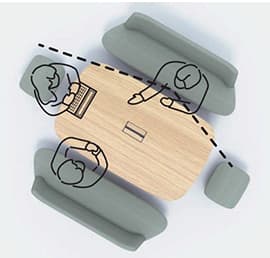 どこに座ってもテーブルを最大限に活用できる形状が特徴です。長手方向に座ると自然と視線が中央に向くため、コミュニケーションの活性化が期待できます。