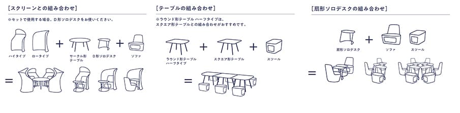 ラインアップは、「スクリーン」(ハイタイプ、ロータイプ)、「ソファ」(1人掛、2人掛)、「スツール」、「テーブル」(サークル形、スクエア形、ラウンド形、ラウンド形ハーフタイプ)、「ソロデスク」(扇形、D形)を用意。スクリーンのクロスは3色、ソファ・スツールのクロスは2色、テーブル・ソロデスクの天板メラミンは2色からお選びいただけます。
