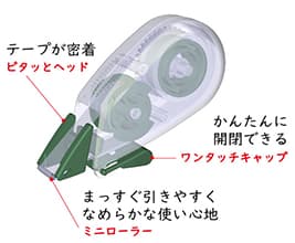 独自機能として、指1本で自動開閉可能な「ワンタッチキャップ」や、直進性に優れ、なめらかな使い心地を実現する「ミニローラー」、テープ浮きを防ぎ密着性を高める「ピタッとヘッド」、左利き対応など、抜群の使いやすさを実現しています。