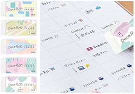 「デコラッシュ」は、薄くて凸凹しない転写式フィルムテープ。手帳が分厚くならず、インクのにじみや裏抜けしないイラストを描いたような仕上がりに。長さも自由にコントロールできるので、ワンポイントデコ、長く引いてラインデコも思いのままです。