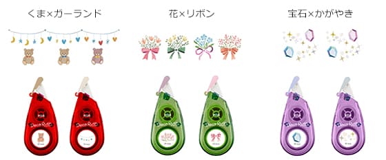 セットに含まれる太幅10mmタイプのテープは、全6種類の限定デザイン(2柄セット×3種)をラインアップ。赤いケースに「くま×ガーランド」柄をセットした「Bear Set(ベアーセット)」、緑のケースに「花×リボン」柄をセットした「Bouquet Set(ブーケセット)」、クリアーケースに「宝石×かがやき」柄をセットした「Jewelry Set(ジュエリーセット)」と、初めてデコラッシュを使う方でも簡単に本格的なアレンジが楽しめる柄となっています。メーカー希望小売価格は、各990円(税込)です。
