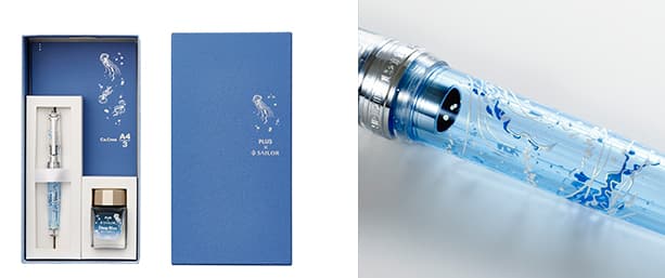 プラスとセーラー万年筆が共同運営している万年筆・文房具ギフトショップ「ancora(アンコーラ)」(https://www.ancora-shop.jp)では、アンコーラ限定バージョンの「海月セット」を数量限定で同時発売します。メーカー希望小売価格(税込)は、38,500円です。