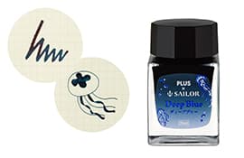 深い海の色をイメージし、新たに調色した限定ディープブルーです。幻想的なブルーブラックは、ノートのクリーム色の中紙にもきれいに発色し、色の濃淡が楽しめます。また、ラベルはクラゲをイメージしたデザインにブルーの箔押しがあしらわれています。使い切りやすく、かわいらしい20mlのミニボトル入りです。