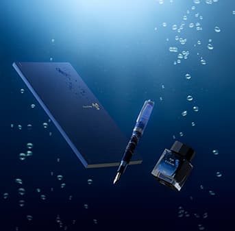 コラボレーション企画第8弾のテーマは“海月”。ノートには、暗い海の中をきらきらと光るクラゲをブルーの箔押しを施しました。万年筆は、海の深さを連想させるネイビーのボディ全体に、儚く光るクラゲをクリアパープルの蓋で表現。水のきらめきを思わせる細かいシルバーラメに、クラゲや水の流れをさりげなく感じさせる繊細なデザインで、14金のペン先にはクラゲと月を、蓋栓にはワンポイントでクラゲの頭をあしらいました。また、インクカラーは深い海の色をイメージしたディープブルーを新たに調色。ギフトボックスも海を連想させるブルーカラーでまとめました。まるで儚く消えてしまうような透明感と、暗い海の中できらきらときれいに輝くクラゲを感じていただける、幻想的なステーショナリーセットです。