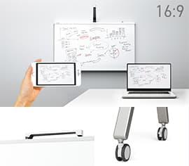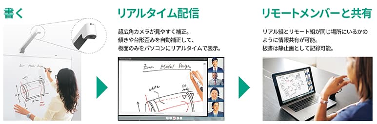遠隔参加者が参加意識を高めながら議論への集中をサポートできるように、ボード上部に搭載された超広角レンズと補正機能を備えた専用カメラが、板面全体を見やすく映し出し、LAN経由でリアルタイムにリモート参加者のパソコン画面に表示します。書く人が板面にかぶって見えないことによるストレスも解消します。