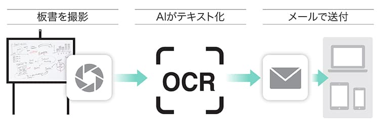 板面に書いた手書き文字を撮影し、OCR機能でテキスト化した文書をメール送付。議事録作成の手間を軽減します。