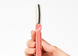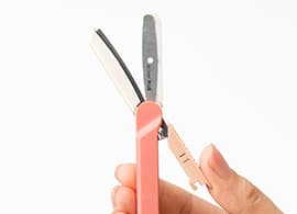 独自設計の“スマートハンドル”により、ハンドルを前方へスライドするだけで刃が開き、ワンタッチですぐに使えます。閉じる際はハンドルを後方へスライドするとロックがかかり、片手で簡単に操作できます。