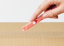 開梱カッターは、さびにくく切れ味が長持ちするセラミック製。自動的にロックがかかるので、不意に刃が出る心配がありません。また刃を短く設計することで開梱時に荷物を傷つけるリスクを抑えました※。