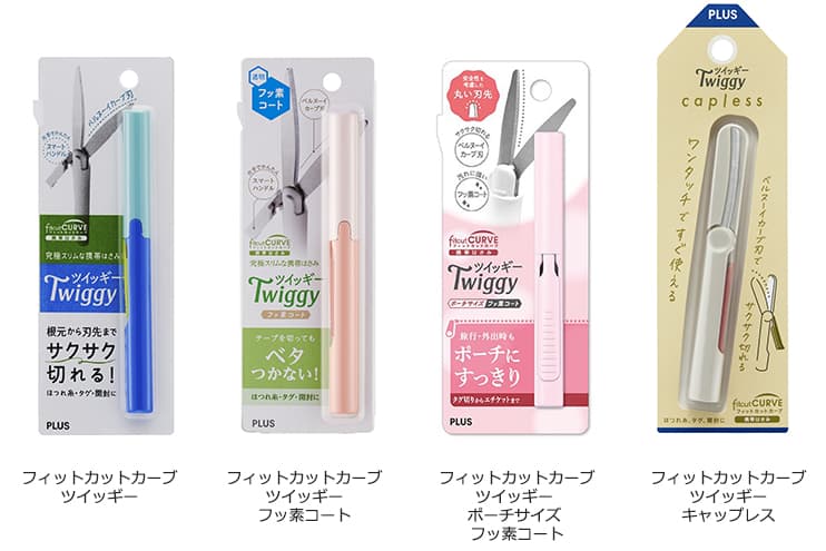 各種数量限定デザインに加えて、2019年2月に粘着物を切ってもベタつかない「ツイッギー フッ素コート」、2020年2月にシリーズ最小の「ツイッギー ポーチサイズ フッ素コート」、2024年8月にキャップレス仕様の「ツイッギー キャップレス」を発売。用途やシーンに合わせて選べるラインアップです。