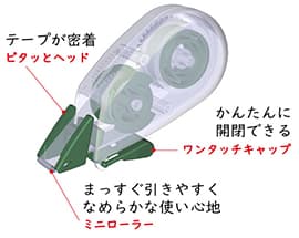 独自機能として、指1本で自動開閉可能な「ワンタッチキャップ」や、直進性に優れ、なめらかな使い心地を実現する「ミニローラー」、テープ浮きを防ぎ密着性を高める「ピタッとヘッド」、左利き対応など、抜群の使いやすさを実現しています。