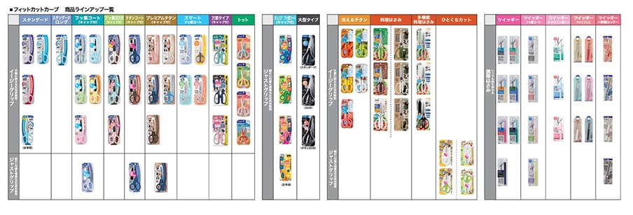 常に最適な刃の開き角度を保つ"ベルヌーイカーブ刃"※2を搭載することで、“根元から刃先まで軽い切れ味”を実現した「フィットカットカーブ」シリーズは、国内外から高い評価をいただき、2012年の発売以降、シリーズ累計5,000万本以上の売上を達成※3。“料理はさみ”“幼児用はさみ”“携帯はさみ”“開梱用”など、幅広いラインアップを展開し、多くの方にご愛用いただいています。