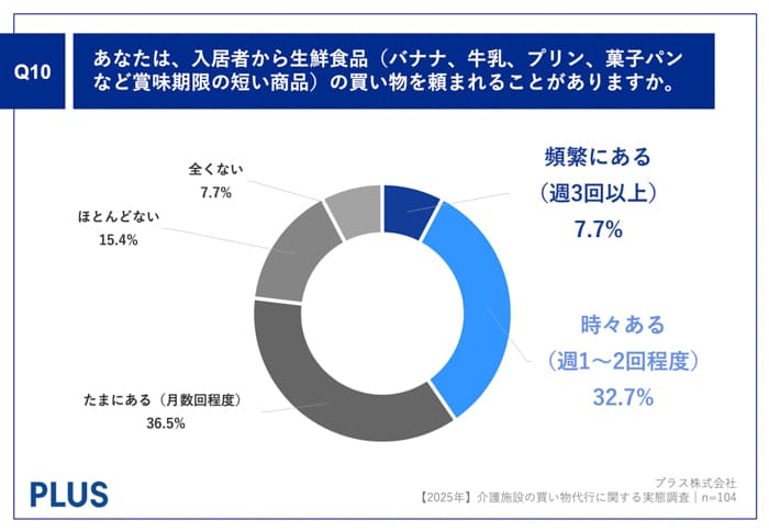 「Q10.あなたは、入居者から生鮮食品(バナナ、牛乳、プリン、菓子パンなど賞味期限の短い商品)の買い物を頼まれることがありますか。」(n=104)と質問したところ、「頻繁にある(週3回以上)」が7.7%、「時々ある(週1~2回程度)」が32.7%という回答となりました。