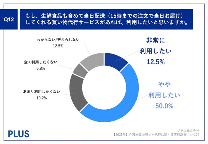 「Q12.もし、生鮮食品も含めて当日配送(15時までの注文で当日お届け)してくれる買い物代行サービスがあれば、利用したいと思いますか。」(n=104)と質問したところ、「非常に利用したい」が12.5%、「やや利用したい」が50.0%という回答となりました。