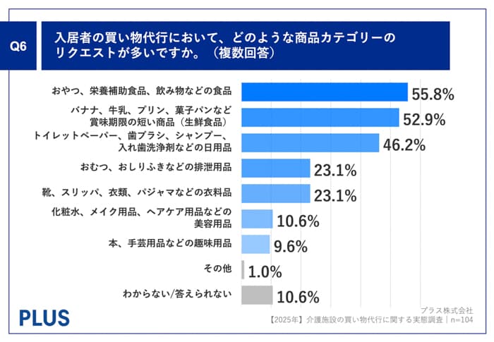 「Q6.入居者の買い物代行において、どのような商品カテゴリーのリクエストが多いですか。(複数回答)」(n=104)と質問したところ、「おやつ、栄養補助食品、飲み物などの食品」が55.8%、「バナナ、牛乳、プリン、菓子パンなど賞味期限の短い商品(生鮮食品)」が52.9%、「トイレットペーパー、歯ブラシ、シャンプー、入れ歯洗浄剤などの日用品」が46.2%という回答となりました。