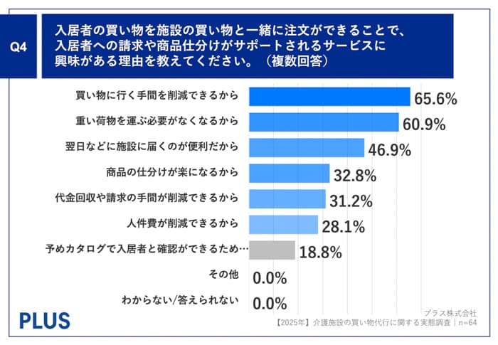 Q3で「とても興味がある」「やや興味がある」と回答した方に、「Q4.入居者の買い物を施設の買い物と一緒に注文ができることで、入居者への請求や商品仕分けがサポートされるサービスに興味がある理由を教えてください。(複数回答)」(n=64)と質問したところ、「買い物に行く手間を削減できるから」が65.6%、「重い荷物を運ぶ必要がなくなるから」が60.9%、「翌日などに施設に届くのが便利だから」が46.9%という回答となりました。