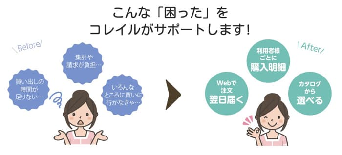 「COREIL(コレイル)」は、介護施設のスタッフが日用品や備品のついでに、入居者様のお買い物もまとめて注文できるお買い物代行サポートサービスです。スマート介護で取り扱う豊富な商品群から選ぶことができ、注文はまとめてWeb発注、仕分けや請求もスムーズに行えます。荷物に同梱される納品案内書には入居者様のお名前が表示され、利用者ごとの購入明細もWebからダウンロード可能。事務処理の手間を大幅に削減し、介護本来の時間を取り戻します。