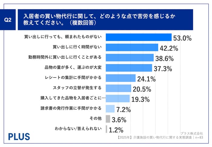 Q1で「かなりある」「少しある」と回答した方に、「Q2.入居者の買い物代行に関して、どのような点で苦労を感じるか教えてください。(複数回答)」(n=83)と質問したところ、「買い出しに行っても、頼まれたものがない」が53.0%、「買い出しに行く時間がない」が42.2%、「勤務時間外に買い出しに行くことがある」が38.6%という回答となりました。
