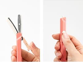 家庭用はさみのNo.1※1ブランド「フィットカットカーブ」シリーズの携帯はさみ「ツイッギー」に、セラミック製の開梱カッターをプラス。はさみとカッターそれぞれの特性を生かして開梱・開封のあらゆるシーンに1本で対応し、梱包テープや封筒、袋、タグ、PPバンド、フィルムなどさまざまな素材をスムーズに切ることができます。はさみ部分は、ベルヌーイカーブ刃※2によるサクサクとした快適な切れ味はそのままに、キャップレス仕様でさっと使える手軽さと安全性を両立。開梱カッターは、段ボールの厚さに合わせた長さで、荷物の中身を傷つけにくい設計です。ネオジム磁石内蔵で、玄関ドアなどに付けて保管ができます。