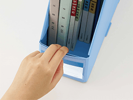 名前を記入したカードを入れる前面のポケットは、横方向から差し込むサイドイン式。ボックスを引き出す際に指が入りにくく、ポケットの破損を防ぎます。