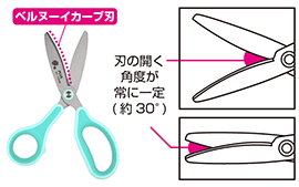 軽い切れ味が特長の、プラス独自の“ベルヌーイカーブ刃”を採用。常に最適な刃の開き角度を保ち、刃の根元から刃先までどの位置でも対象物をしっかりキャッチして切断できます。薄手の紙やビニールはもちろん、画用紙や牛乳パックなどの厚い物まで、子どもの握力でしっかり切ることができます。