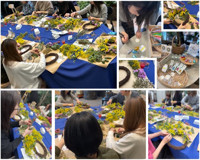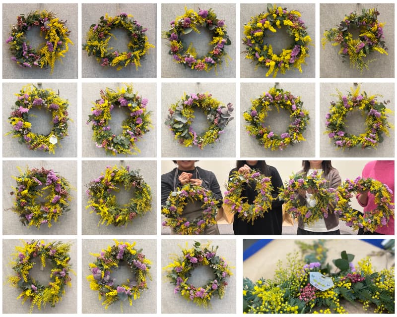 会場は、リースづくりで使用するミモザやスターチスが運び込まれ、目にも鮮やか!ここだけが一足早く春真っ盛りの様相で、ミモザのほかユーカリが優しく香っていました。