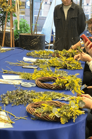 2025年2月19日(水)恵比寿ガーデンプレイス2階のSALONスペースにて、「幸せの黄色いミモザ、春三日月リースづくりワークショップを開催しました。