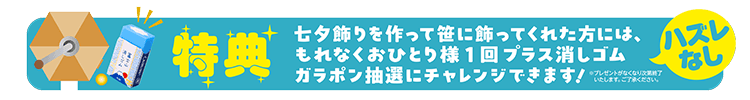 特典:七夕飾りを作って笹に飾ってくださった方は、もれなくお1人様1回、プラス消しゴムが当たるガラポン抽選にチャレンジできます!