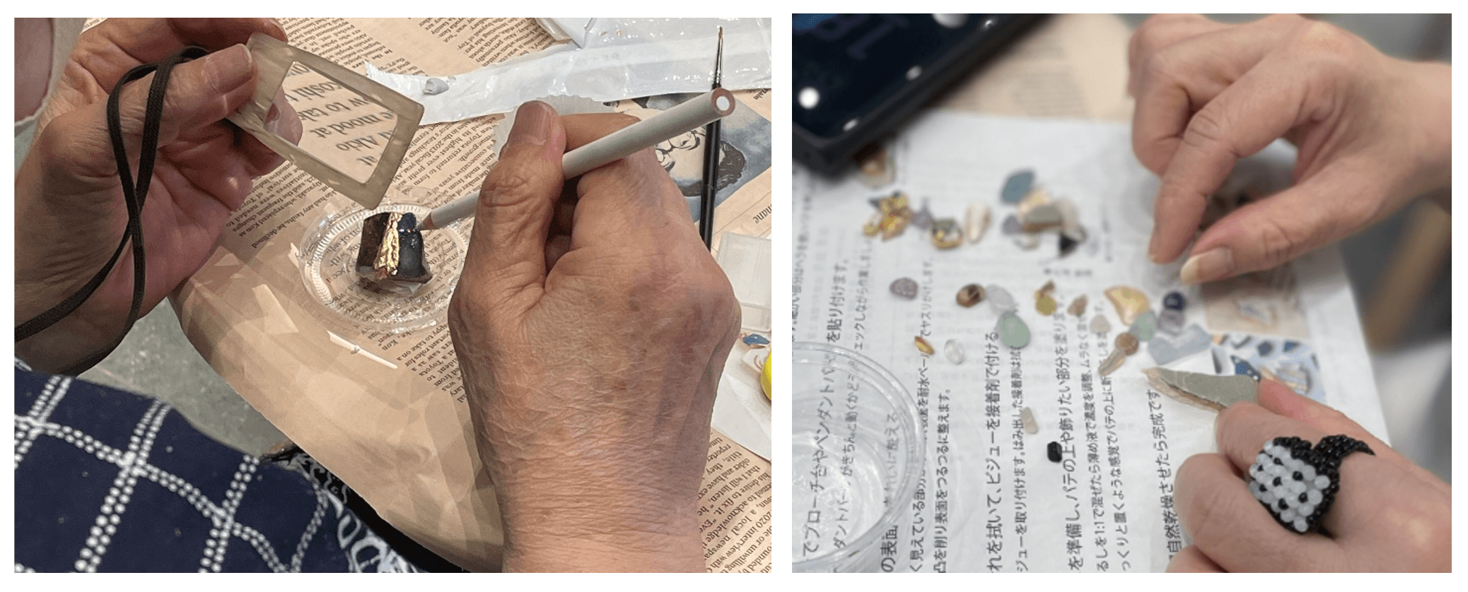 陶片を使用したアクセサリー作りは様々な形のパーツを組み合わせ、繋げて装飾をしていきます。