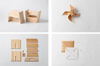 無垢材をシート状にスライスした突板(つきいた)をハサミでカットし、切り込みを入れて組み立てるだけであっという間に完成。お好みで色を塗っても楽しいですよ。
