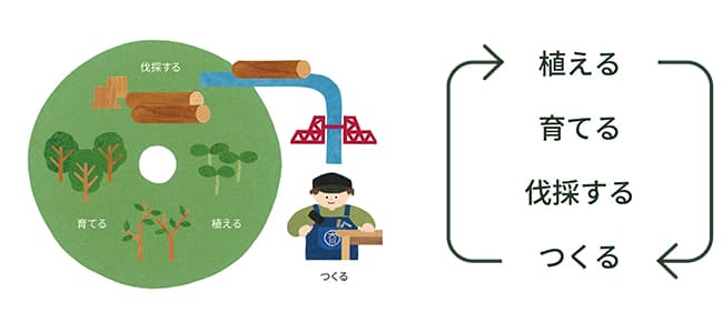 また、2018年からセンダンの植樹活動を始めており、消費者、住宅メーカー、工務店、家具メーカー、森林組合・自治体が共同で植樹することで、センダンを積極的に活用し、持続可能なサイクルを構築することを目指しています。