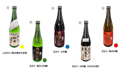 荒走りの説明が始まるタイミングにあわせ、5種類のお酒を少しづつ注いだ試飲用のセットをご用意し、お配りしました。