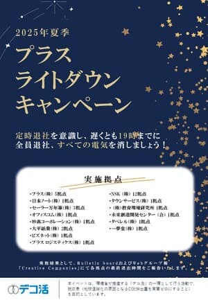 7~9月、プラスグループ28拠点にて、一斉消灯活動「プラスライトダウンキャンペーン(夏季)」を実施しました。本活動は、環境省が推進する「脱炭素につながる新しい豊かな暮らしを創る国民運動(通称:デコ活)」に賛同し、脱炭素の推進を目的としています。